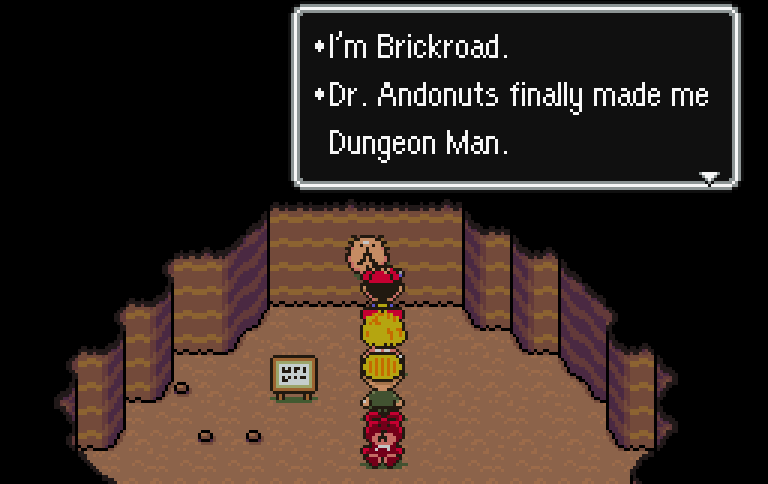 With no real enemies to fight on the third floor, it takes no time at all to pass through it and up to the top floor. Here we finally get to see what Brickroad has done to himself. With his face sticking out of one of the wall, there’s really no questioning that he has BECOME a Dungeon Man like he always wanted.